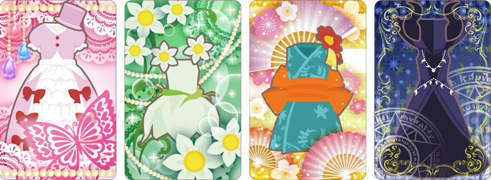 【アプリ】おてつだいプリンセス! works:前社 担当箇所: おてつだいけんイラスト / ドレスカードデザイン 使用ツール:Illustrator・Photoshop ■おてつだいけんイラスト (20 種。1 つ 30 分程度。) ■ドレスカードデザイン ドレスのデザインに沿ったイメージでデコレーションしました。(9 種。1 デザイン 8 時間程。)