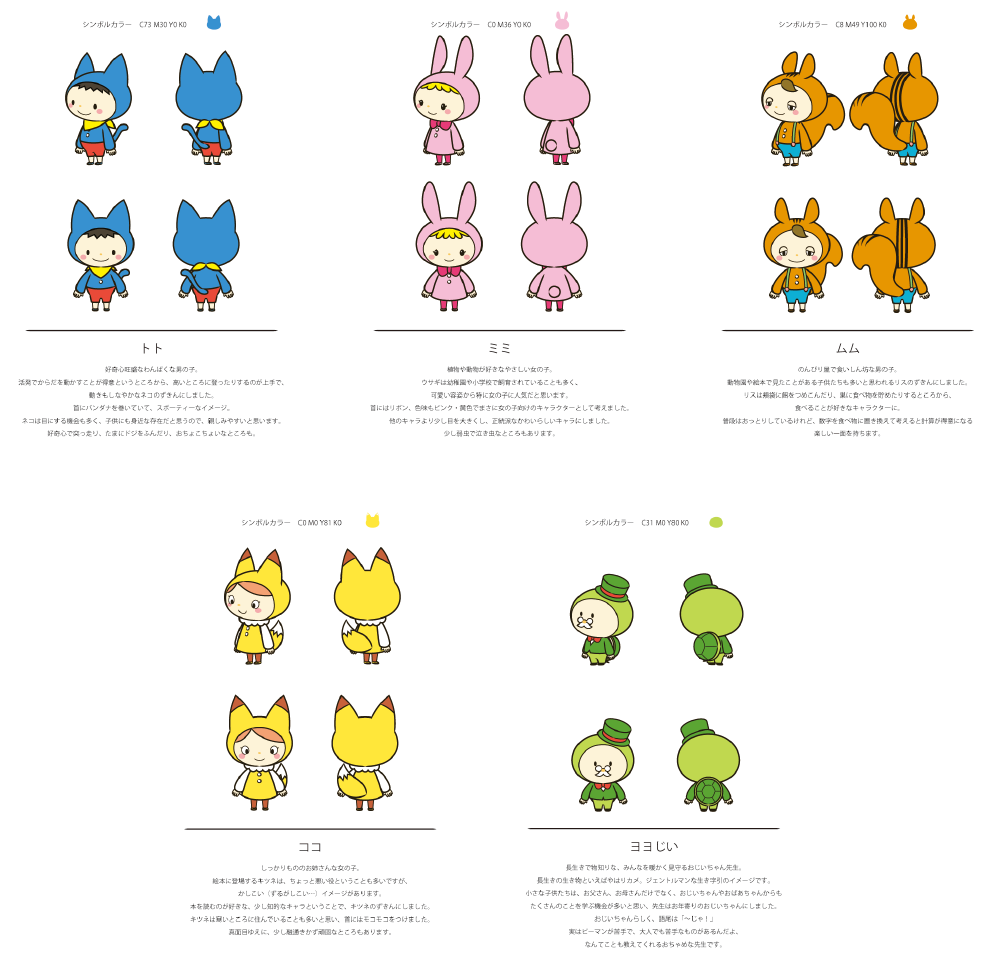 キャラクターの名前は、みんな2つの同じ文字が続くものにし、口に出したときに響きが楽しく、覚えてもらいやすくしました。
